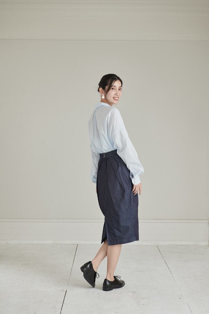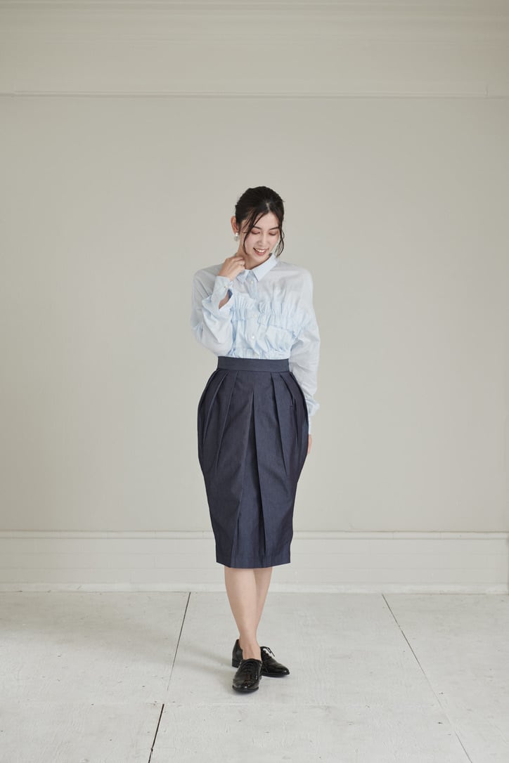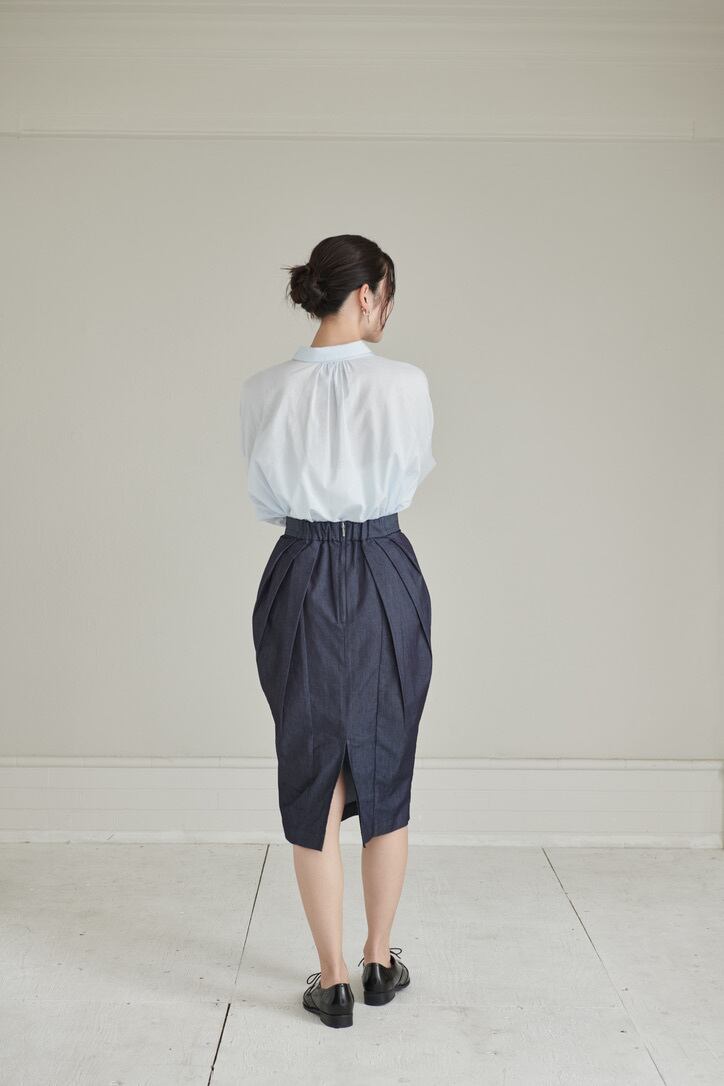 タック使いがデザイン性溢れるスカート。まるでチューリップのようなフォルムが体をふんわりと包みます。